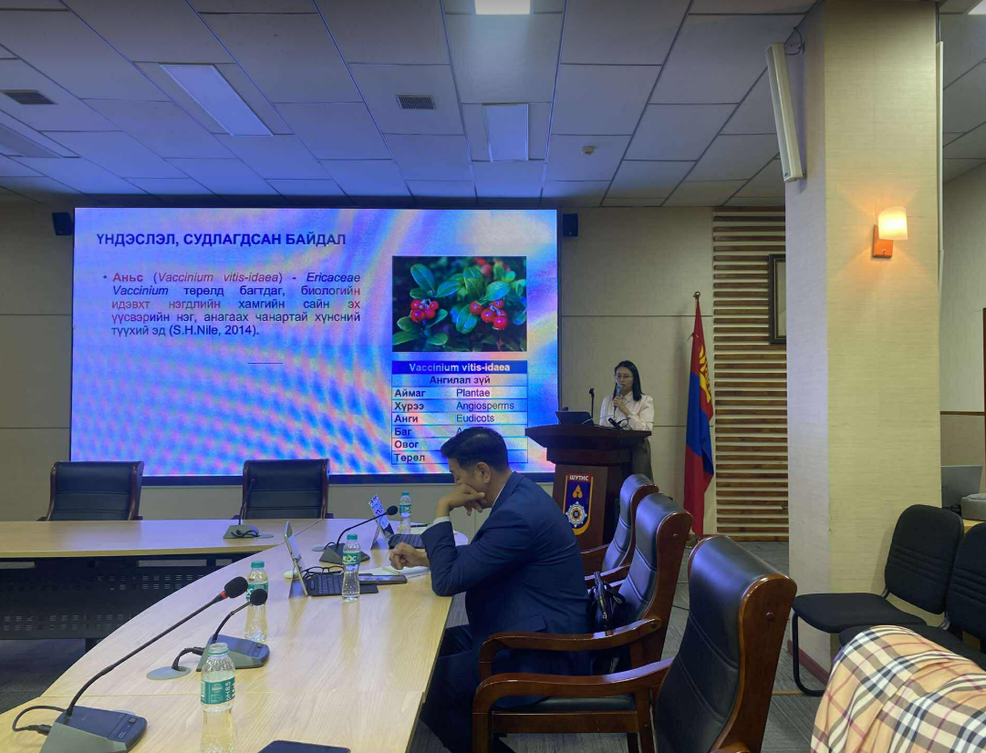 Эрдэм шинжилгээний бага хуралд Хүнсний үйлвэрлэл технологийн их сургуулийн багш П. Байгалмаа (Ph.D) нь “Зэрлэг аньс, жимсний зарим биологийн идэвхт нэгдлийн судалгаа” сэдвээр илтгэлээ амжилттай хэлэлцүүлж, хүнсний биотехнологийн судалгааны хөгжилд чухал хувь нэмэр орууллаа.