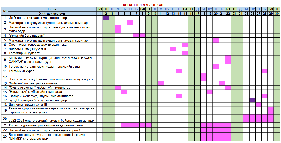 2025-2026 ОНЫ ХИЧЭЭЛИЙН ЖИЛИЙН I УЛИРАЛД ХИЙХ АЖЛЫН КАЛЕНДАРЧИЛСАН ТӨЛӨВЛӨГӨӨ