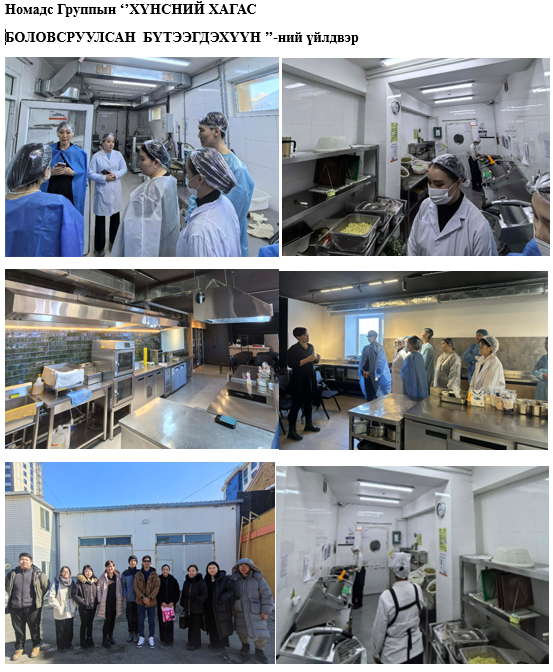 Манай анги (огноо)-ны өдөр (үйлдвэрийн нэр)-д танилцах дадлага хийсэн. Хүнсний Үйлдвэрлэл, Технологийн Их Сургуулийн ХҮҮТ-3б, ХҮҮТ, ХҮТ, ХЗШС, ХЧАБ, ХТКС-1а ангийн оюутнууд, ХҮТ тэнхимийн багш Э.Батчимэг нартай БАЯНГОЛ ресторан, NOMADS hospitality -ийн ‘’Хүнсний хагас боловсруулсан бүтээгдэхүүний үйлдвэтэй’’ танилцах дадлага хийсэн. Дадлагын үеэр бид тухайн үйлдвэрийн түүх, үйлдвэрлэлийн үйл явц, түүхий эдийн хэрэглээ, бүтээгдэхүүн үйлдвэрлэх шат дамжлага, чанарын хяналтын систем болон ажилчдын хөдөлмөрийн нөхцөлтэй танилцсан. Мөн үйлдвэрийн тоног төхөөрөмжийн ажиллагаа, үйлдвэрлэлийн зохион байгуулалт, аюулгүй ажиллагааны дүрмийн талаар мэдээлэл авсан. Оюутнуудад Аж ахуй нэгж байгууллагын танилцууллагыг БАЯНГОЛ рестораны еранхий менежер н.Уламбаяр, NOMADS группын сургалтын менежер Г.Янжмаа нар танилцуулаг тайлбар хийж хамтран ажилласан.